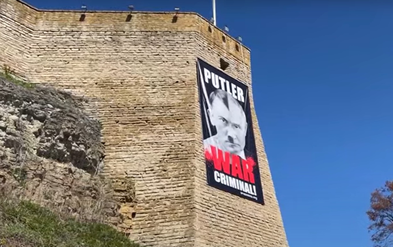 Tämä juliste Narvassa sai Kremlin tolaltaan. Kuvakaappaus videolta / YOUTUBE
