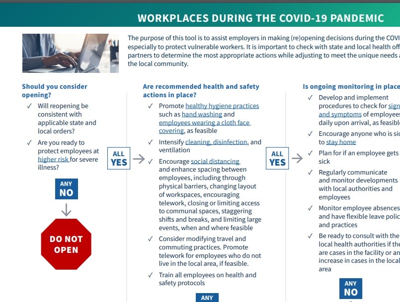 The CDC has released six "decision trees" aimed at helping businesses, communities, schools, camps, day cares and mass transit decide on whether it's safe to reopenhttps://t.co/ziBnrzX1qm pic.twitter.com/0mq4yu5kQ3