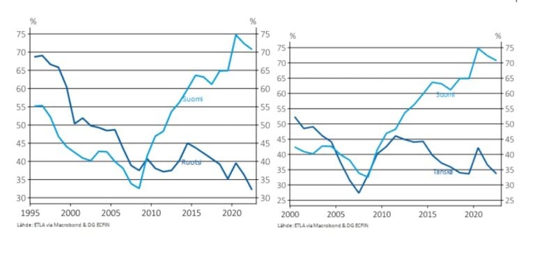 Jutun alta löytyvissä kuvissa näkyy, että muissa Pohjoismaisssa velkasuhde on painunut alas toisin kuin Suomessa.