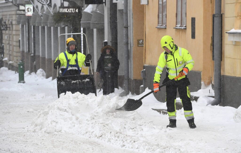 Lumitöitä tehtiin Sofiankadulla Helsingissä. LEHTIKUVA / HEIKKI SAUKKOMAA