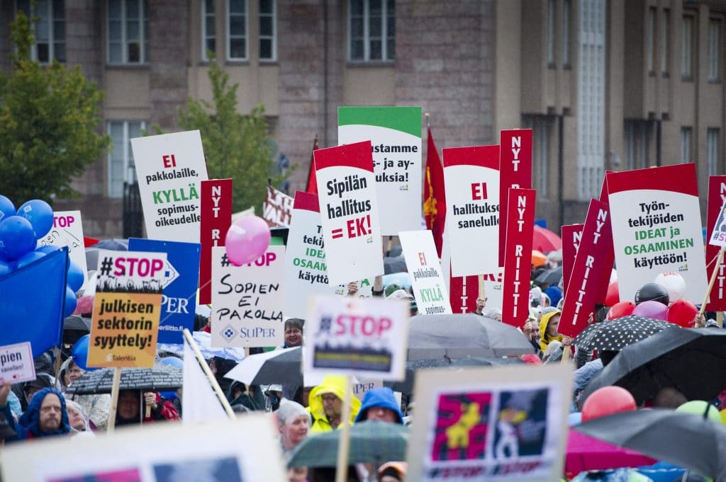 Mielenilmaukseen osallistuneet valtion virkamiehet, joita oli pääkaupunkiseudulla muutamia kymmeniä, poistuivat muutamaksi tunniksi työpaikaltaan ja kokoontuivat Rautatientorilla järjestettyyn suureen mielenosoitukseen. Joukossa oli muun muassa poliiseja ja TE-toimiston henkilökuntaa.