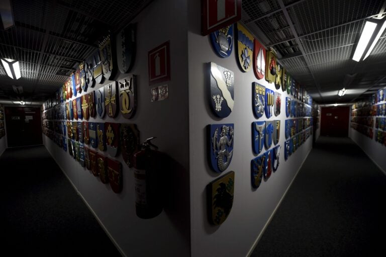 Suomen kuntien vaakunoita Kuntatalon käytävällä Helsingissä. LEHTIKUVA / ANTTI AIMO-KOIVISTO