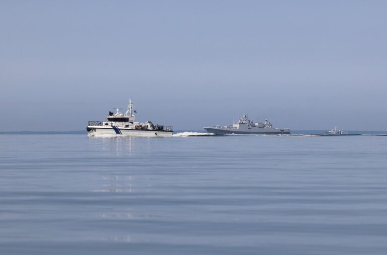 Viestiin liitetyssä kuvassa merivartioston rannikkovartiovene seilaa merellä. Veneen taustalla näkyy kaksi sota-alusta, joista toinen on Pohjanlahdella parhaillaan liikkuva Intian laivaston fregatti INS Tamal.
