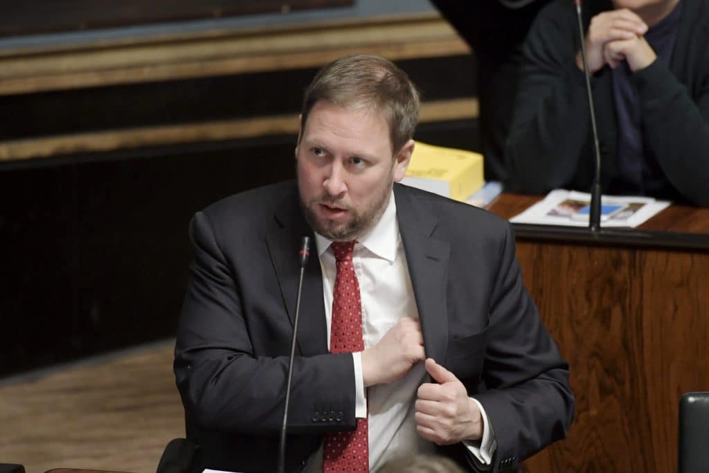 Puhe keskeytyi vasemmistoliiton kansanedustajan Paavo Arhinmäen välihuuteluun.