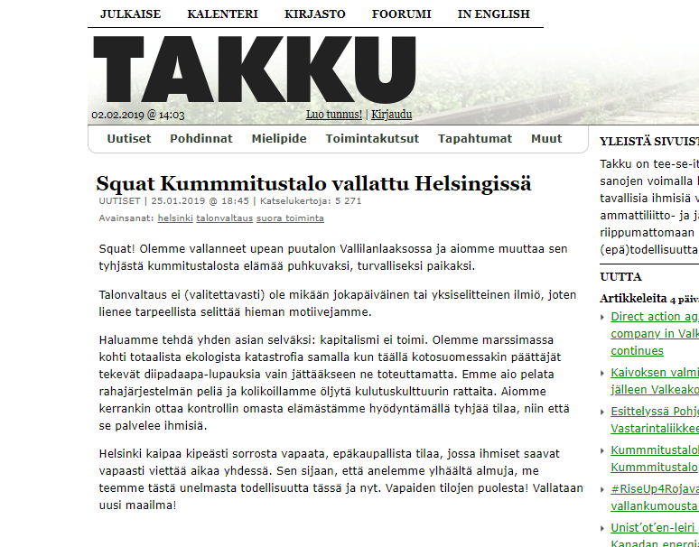 Tekoa perusteltiin anarkistisella Takku-sivustolla.