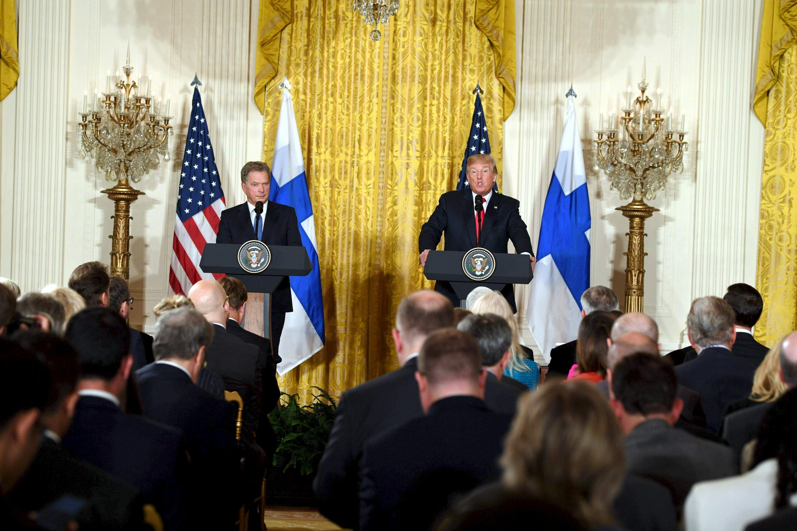 WASHINGTON D.C. Yhdysvaltain presidentti Donald Trumpin ja tasavallan presidentti Sauli Niinistön lehdistötilaisuus Valkoisessa talossa kesti yli puoli tuntia sille varatun 20 minuutin sijaan.