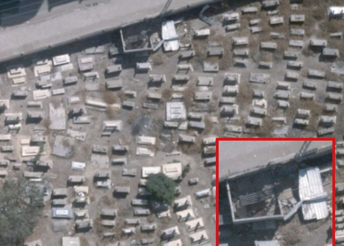 Hautojen keskellä olevan pienen rakennuksen katto oli lähtenyt irti raketin ampumisen yhteydessä.