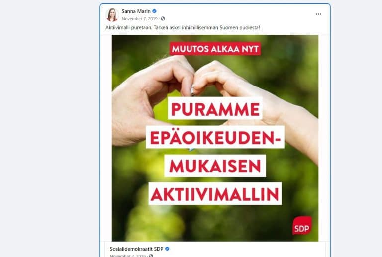 – Aktiivimalli puretaan. Tärkeä askel inhimillisemmän Suomen puolesta!, Sanna Marin kirjoitti 7.11.2019.