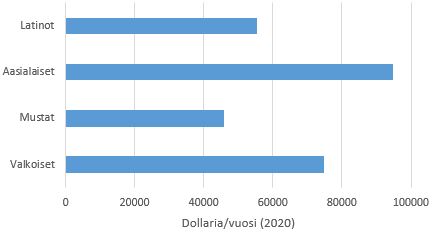 Kuten oheisesta kuviosta ilmenee, aasialaisten tulotaso on selvästi valkoisia korkeampi. Aasialaisten kotitalouksien vuotuinen mediaanitulo on noin 20[nbsp]000 dollaria korkeampi kuin valkoisten amerikkalaisten. Valkoisten ja latinojen välinen tuloero on samaa luokkaa, mutta siis valkoisten eduksi. Aasialaisten tulot ovat peräti kaksi kertaa mustien tuloja korkeammat.