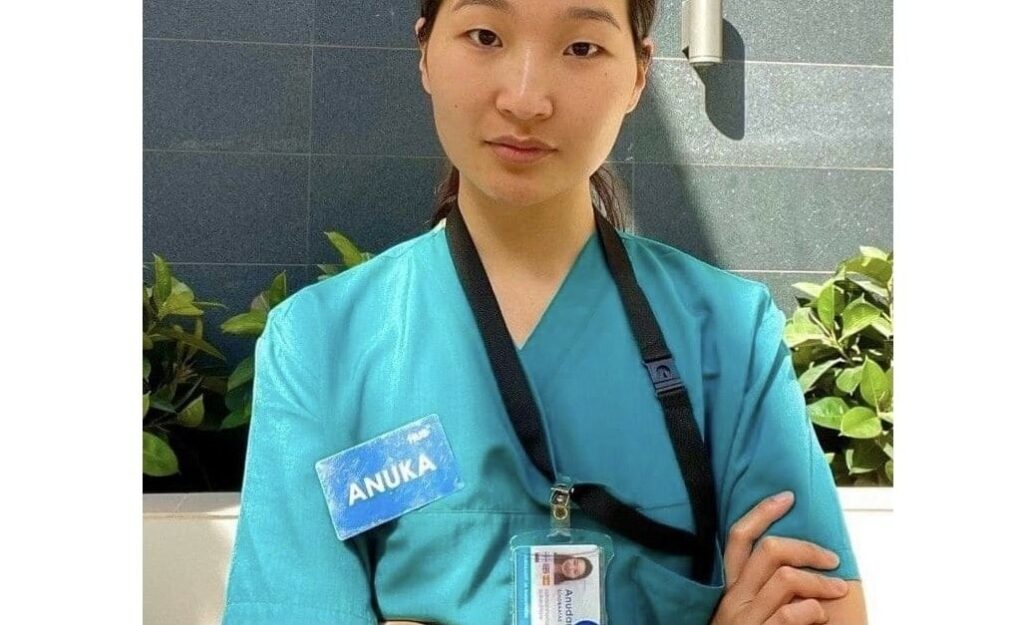 Mongolialaislähtöinen Anuka kertoo työskentelevänsä tällä hetkellä HUS:n Helsingin Meilahden teho-osastolla, missä hän hoitaa muun muassa koronapotilaita. Hän on valmistunut sairaanhoitajaksi Suomessa.