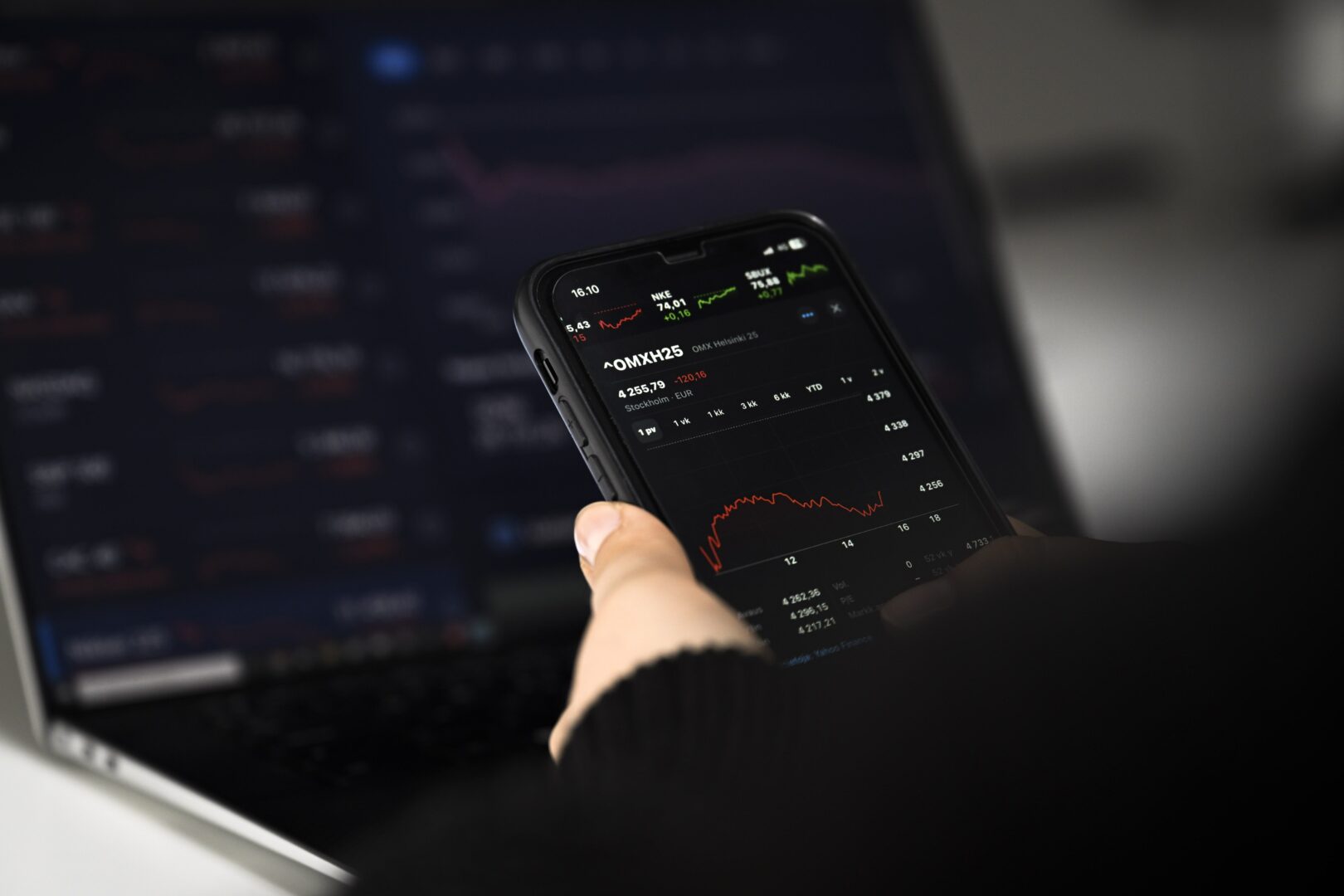 Henkilö katselee pörssikursseja puhelimen ja tietokoneen näytöllä Helsingissä. LEHTIKUVA / EMMI KORHONEN