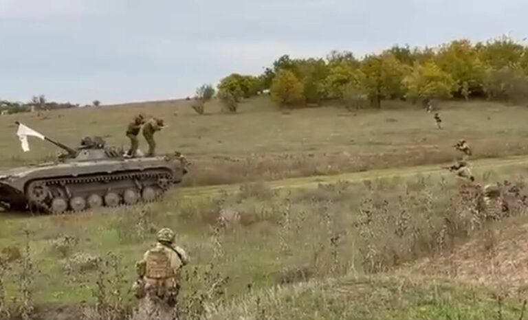 BMP-2:n tykkiin on kiinnitetty valkoinen lippu antautumisen merkiksi. Ajoneuvo ajaa maavallin eteen, jonka suojissa on ryhmä ukrainalaissotilaita. Videolla kaksi miehistön jäsentä tulee ulos vaunusta ja antautuu.