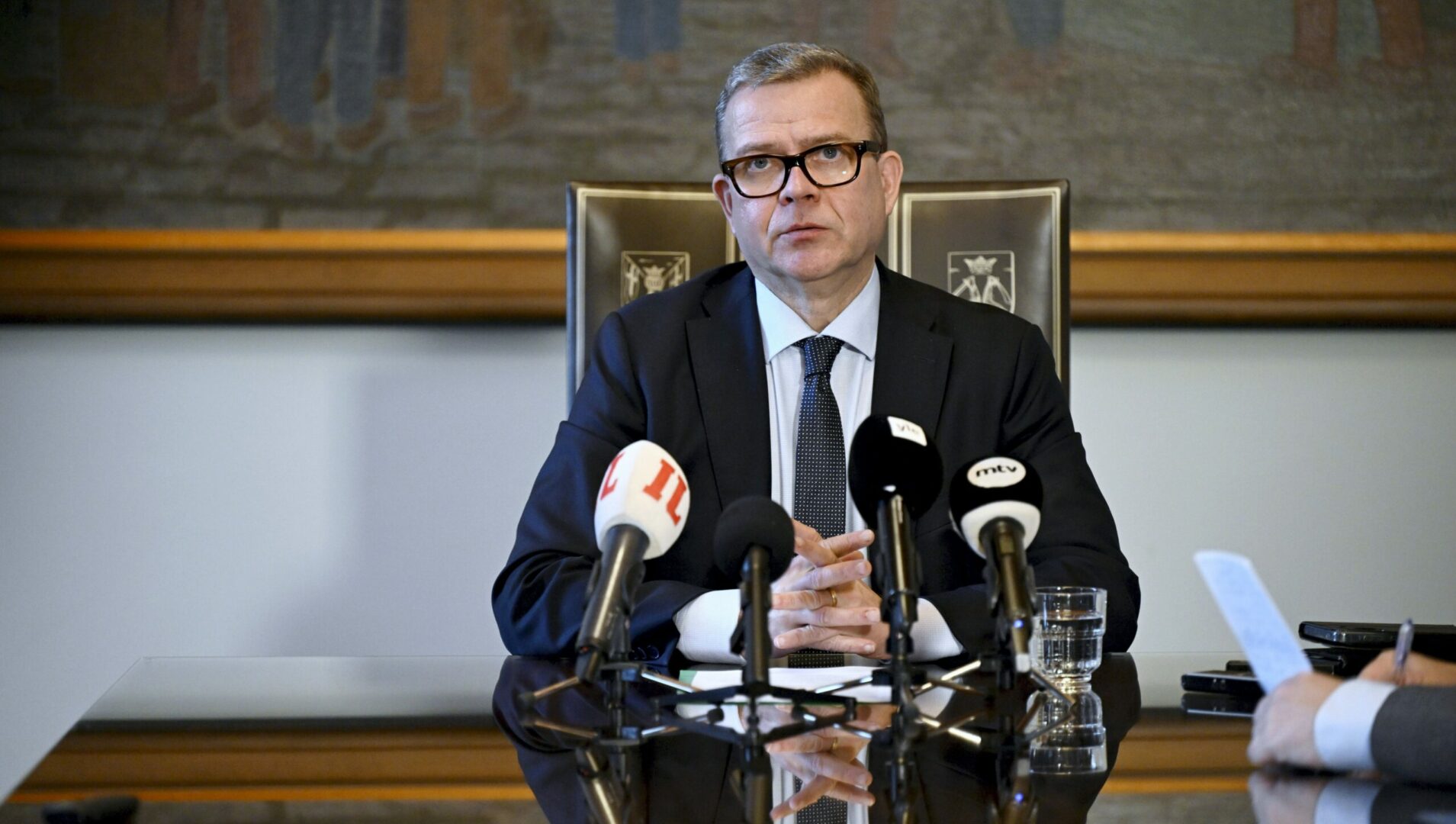 Pääministeri Petteri Orpo mediatapaamisessa eduskunnassa Helsingissä 22. lokakuuta 2025. Tapaamisen aiheena oli 23. - 24. lokakuuta Brysselissä järjestettävä Eurooppa-neuvoston kokous., LEHTIKUVA / EMMI KORHONEN