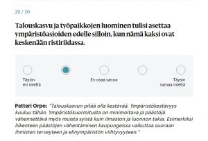– Se on täysin mahdollista. Minä aina inhoan sitä vaalikonekysymystä, kun pitää laittaa että ”kumman valitset”, hyvinvoinnin vai ympäristönsuojelun. Kun ne eivät ole minun mielestäni vastakkaiset. En siitä niin hirveästi pidä, kun meillä on mahdollisuus saada molemmat, Orpo totesi.