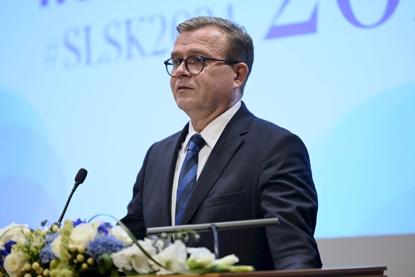 Pääministeri Petteri Orpo puhui Suurlähettiläskokouksessa Helsingissä tänään. LEHTIKUVA / MIKKO STIG