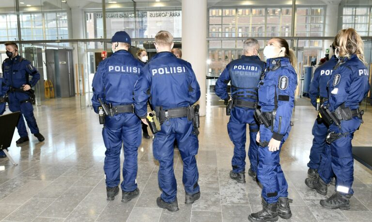 Poliiseja Helsingin käräjäoikeudessa 4. maaliskuuta 2022. Oikeudessa käsiteltiin katujengiläisten suunnittelemaa joukotappelua Kaivohuoneella lokakuussa 2021. LEHTIKUVA/HEIKKI SAUKKOMAA