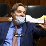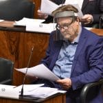 Suojukset on kokenut vaikeaksi tahollaan myös SDP:n Kimmo Kiljunen. Oheisista kuvista voi nähdä hänen tapojaan käyttää kasvomaskia ja kasvovisiiriä viime viikkoina eduskunnan täysistunnoissa.