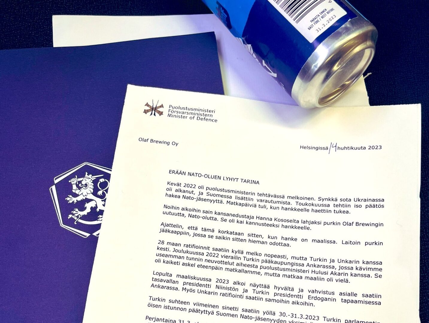 – Perjantaina 31.3. oloni oli varsin helpottunut. Kaikki ratifioinnit olivat kasassa. Illalla oli aika ottaa hyvin jäähdytetty Nato-olut jääkaapista ja korkata purkki. Saunan jälkeen tartuin purkkiin ja kyllähän se maistui, ensipuraisusta alkaen. Siinä siemailun ohessa vilkaisin purkkia vähän tarkemmin, Antti Kaikkonen kirjoitti.