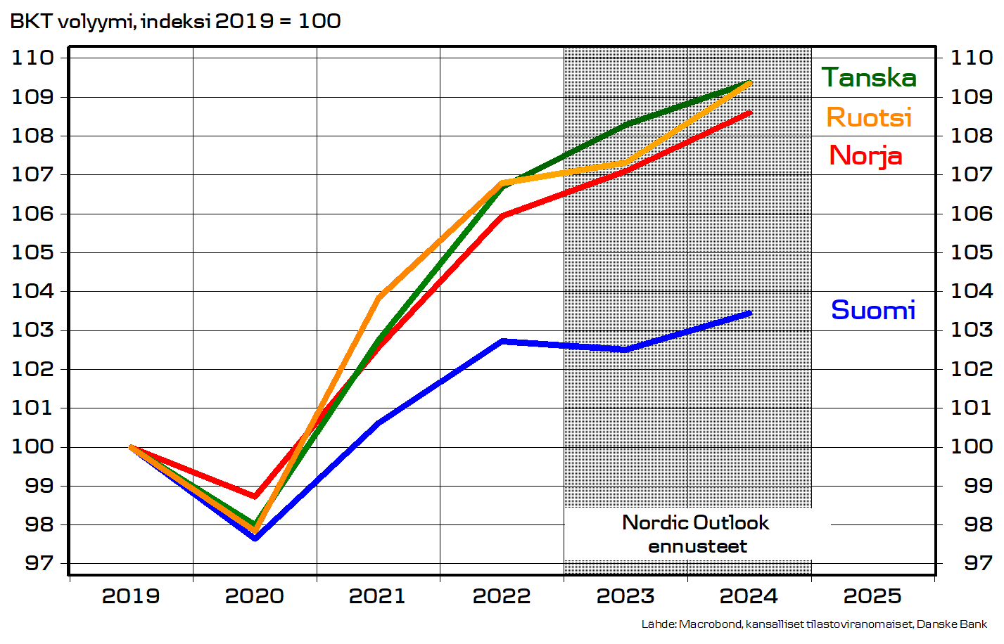 Tiedot perustuvat Danske Bankin julkaisemaan Nordic Outlook -ennusteeseen. Katsauksessa on havaittavissa, että Suomen kehitys on huomattavasti synkempi kuin vertailussa mukana olleiden muiden Pohjoismaiden.