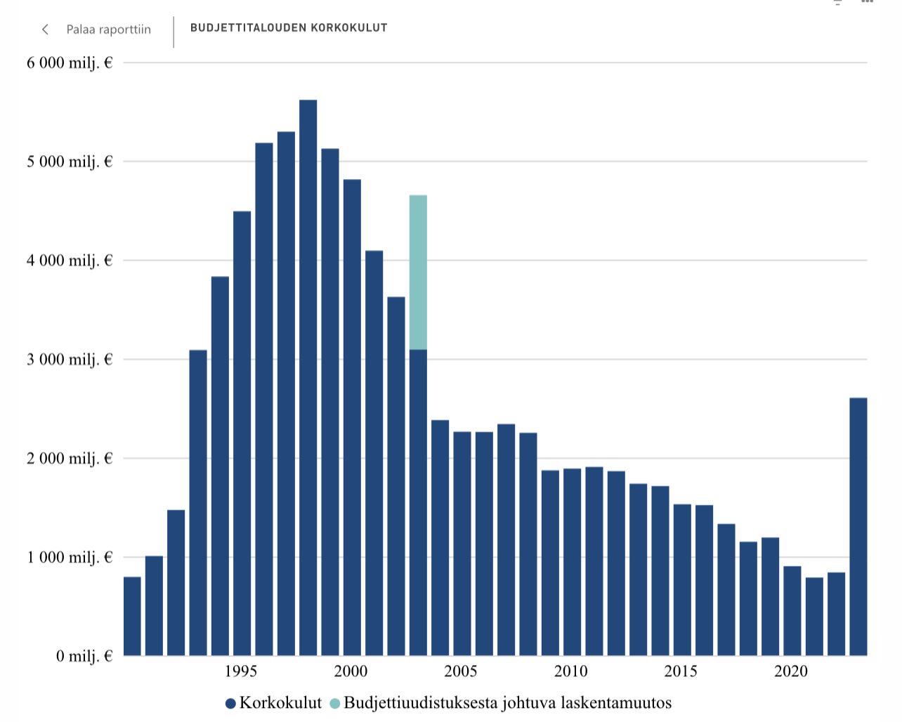 Valtiokonttorin tilastoista ilmenee, että valtion budjettitalouden korkomenot kasvoivat vuonna 3,1 miljardiin euroon. Vielä vuonna 1992 kulut olivat 1,5 miljardia euroa. Kasvua korkomenoissa tapahtui 1,6 miljardin euron verran.