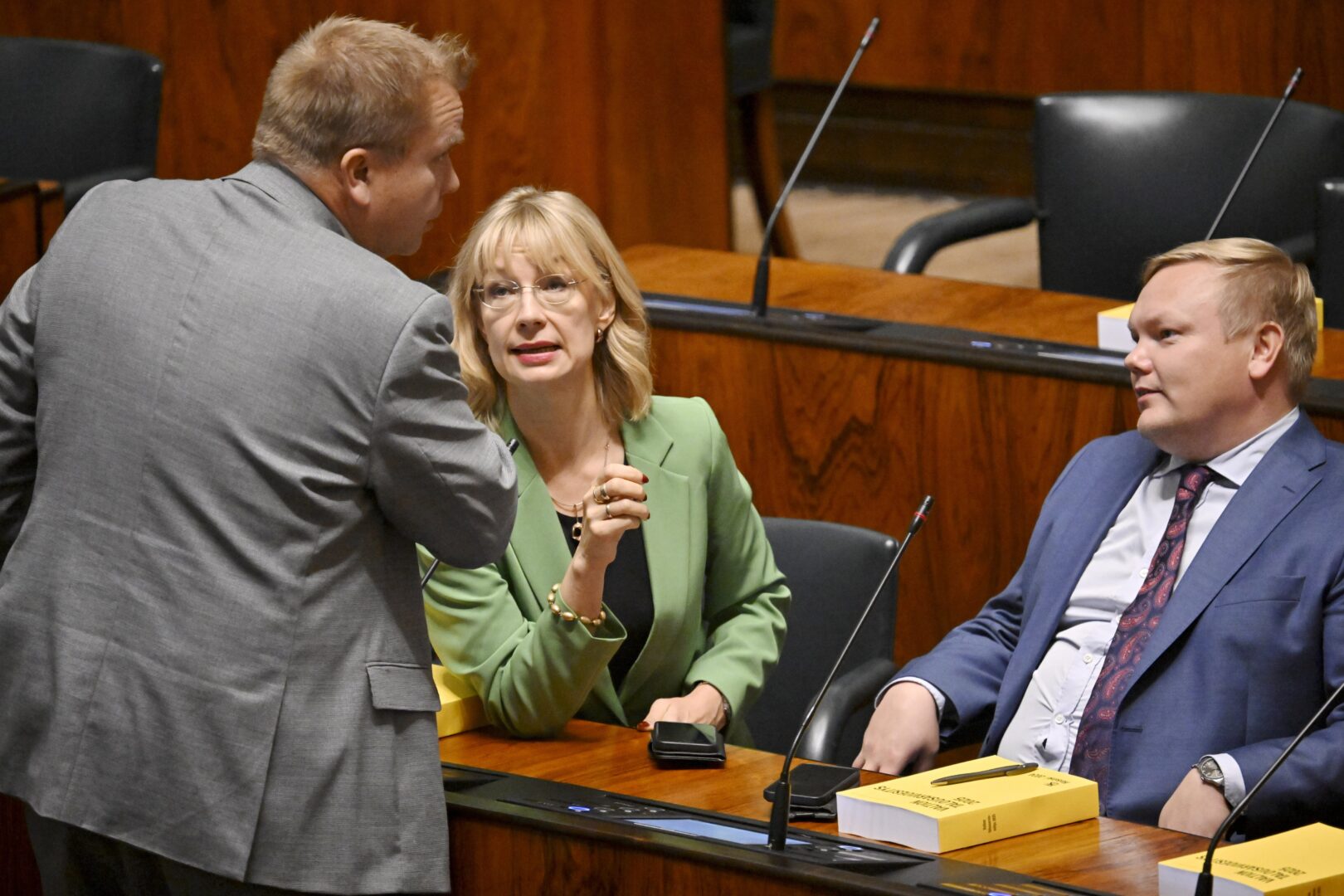 Keskustan kansanedustajat Antti Kaikkonen ja Antti Kurvinen sekä SDP:n Tytti Tuppurainen eduskunnan täysistunnossa Helsingissä 20. syyskuuta 2024., LEHTIKUVA / MARKKU ULANDER