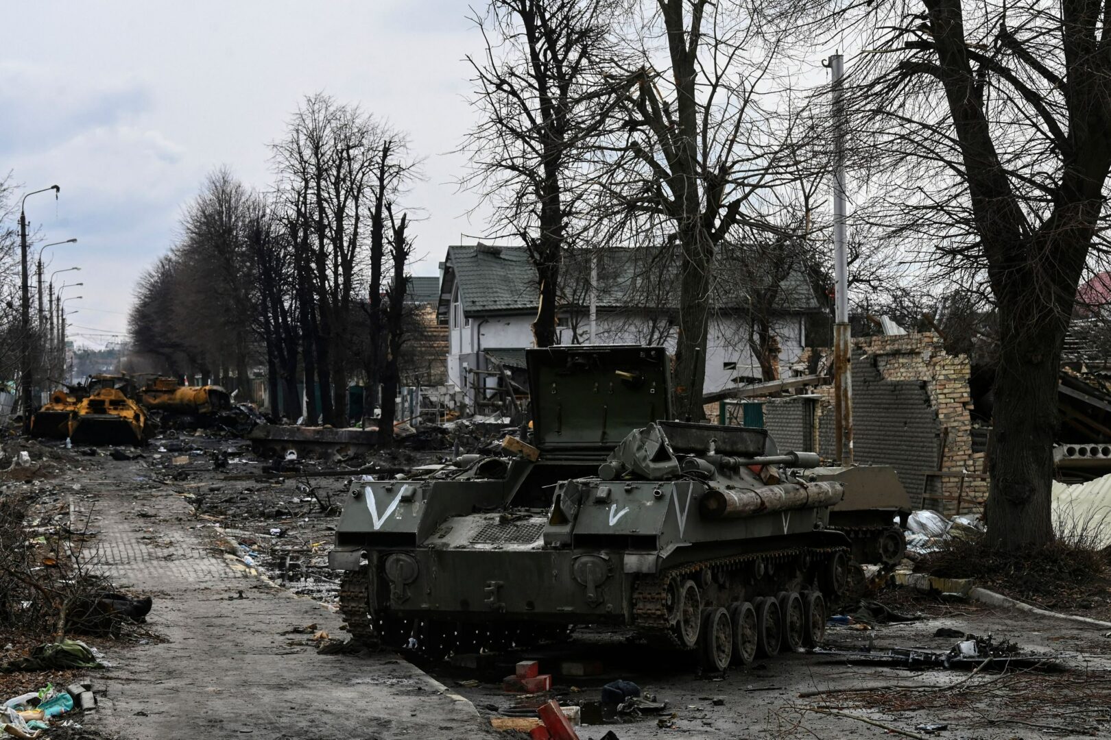 Tuhottu venäläinen panssariajoneuvo Butšassa 4. maaliskuuta 2022. AFP / LEHTIKUVA / ARIS MESSINIS
