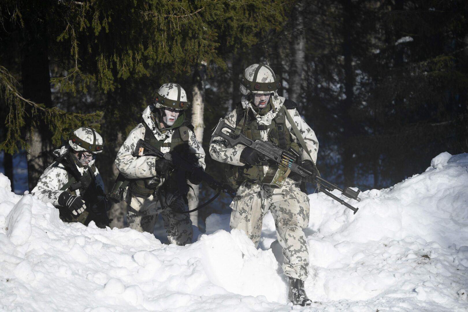 Risto E. J. Penttilä tiivistäisi pohjoismaista puolustusyhteistyötä. Kuvassa suomalaisia varusmiehiä harjoittelemassa Ruotsin Norrbottenissa. LEHTIKUVA / MARTTI KAINULAINEN