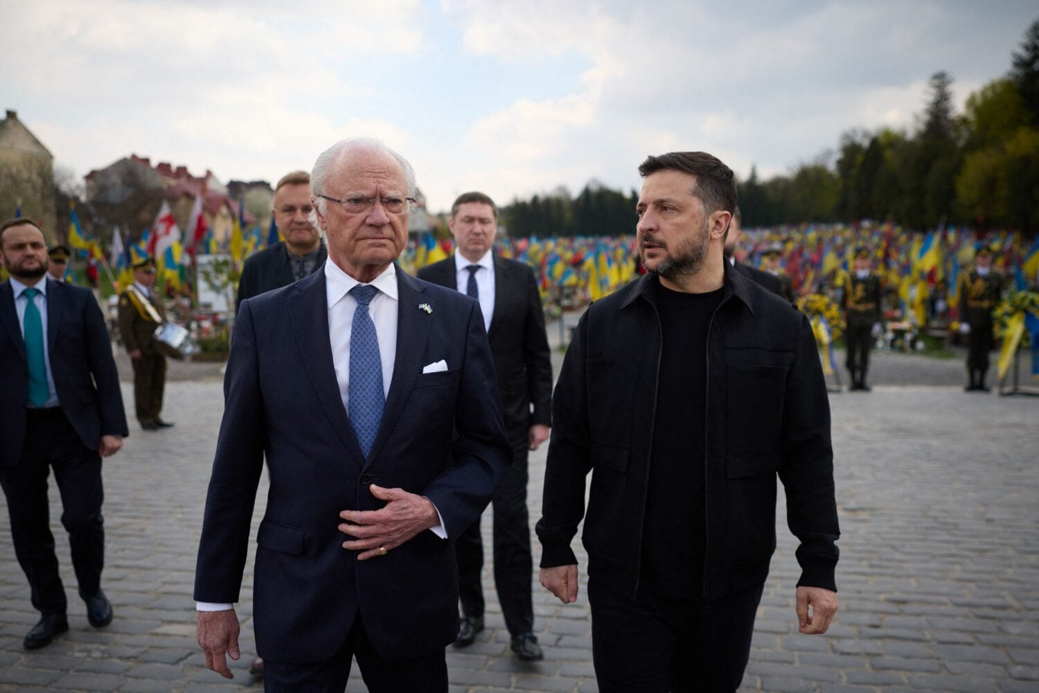 Kuningas laski yhdessä presidentti Zelenskyin kanssa seppeleen sodassa kaatuneiden ukrainalaissotilaiden muistoksi. Zelenskyiä kuningas kuvaili vierailullaan pitämässään puheessa ”suureksi johtajaksi” ja vakuutti Ruotsi tukevan Ukrainaa ”täysin sydämin”.
