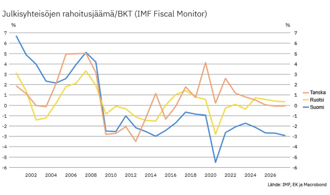 – Tanska ja Ruotsi ovat hienosti ponnistaneet takaisin plussalle hetkellisten alijäämävuosien jälkeen. Suomessa ei ole edes näköpiirissä vuotta, jolloin ylijäämään päästäisiin, Pakarinen toteaa graafista.