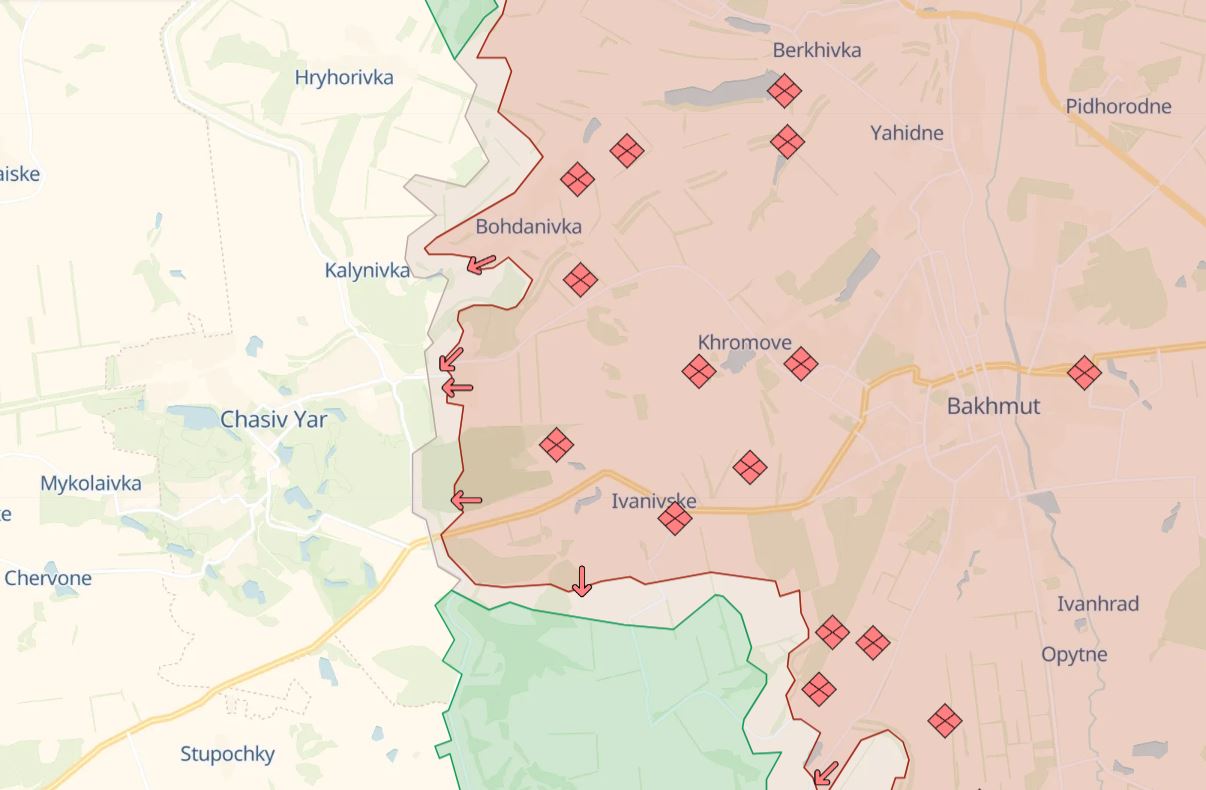 Ukrainan asevoimien mukaan idässä kovin paine on Bahmutin länsipuolella sijaitsevan Tshasiv Jarin kaupungin ympäristössä. Alueelle sijoitetut venäläisjoukot yrittivät ensin murtautua läpi puolustajan sivustoista, mutta siirtyivät epäonnistumisten jälkeen suoriin rynnäköihin.