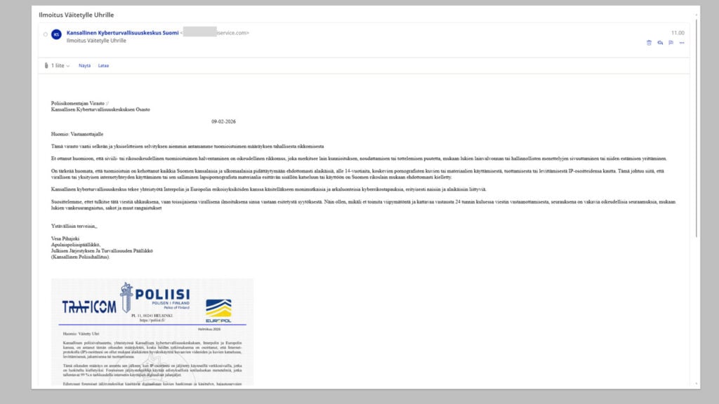 Kyberturvallisuuskeskus muistuttaa, että kyseessä on huijaus, johon ei pidä vastata. Koska kyse on rikollisten lähettämästä kiristysviestistä, siihen ei tarvitse reagoida.