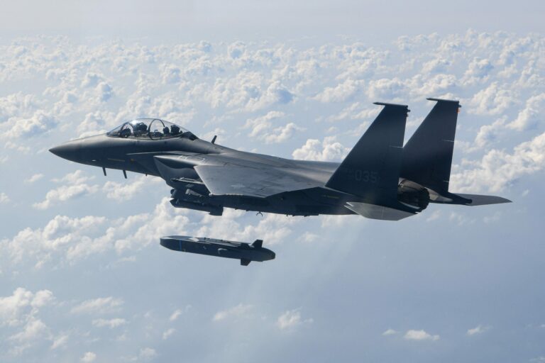 Etelä-Korean ilmavoimien F-15K-hävittäjä laukaisee pitkän kantaman Taurus-ohjuksen harjoituksissa 11. lokakuuta 2024. AFP/LEHTIKUVA/HANDOUT