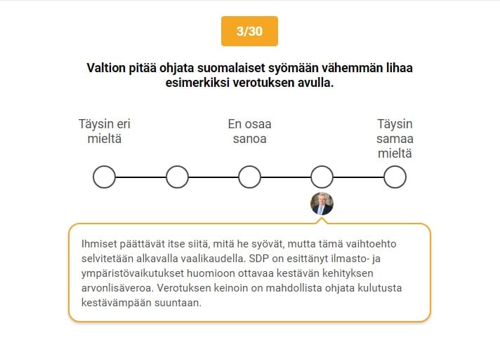 Ylen vaalikoneesta löytyy nyt myös Sdp:n varapuheenjohtajan ja äskeisen vt. puheenjohtajan Sanna Marinin kanta väittämään Valtion pitää ohjata suomalaiset syömään vähemmän lihaa esimerkiksi verotuksen avulla.