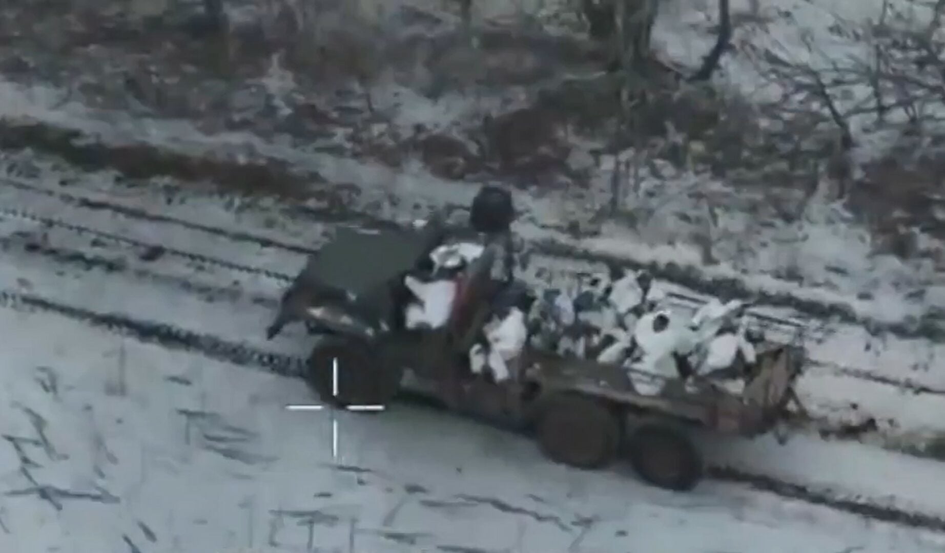 Rynnäkköosaston havaittiin lähestyvän etulinjaa Ural-rekalla, jonka katto ja ovet oli poistettu kokonaan. Kuorma-auto ylitti kraatterien täplittämän lumisen peltoaukean sotilaiden tulittaessa summittaisesti kohti taivaalla lentäviä drooneja. Ajoneuvoon oli ilmeisesti asennettu häirintälaite, joka toi osittaista suojaa lennokeilta.
