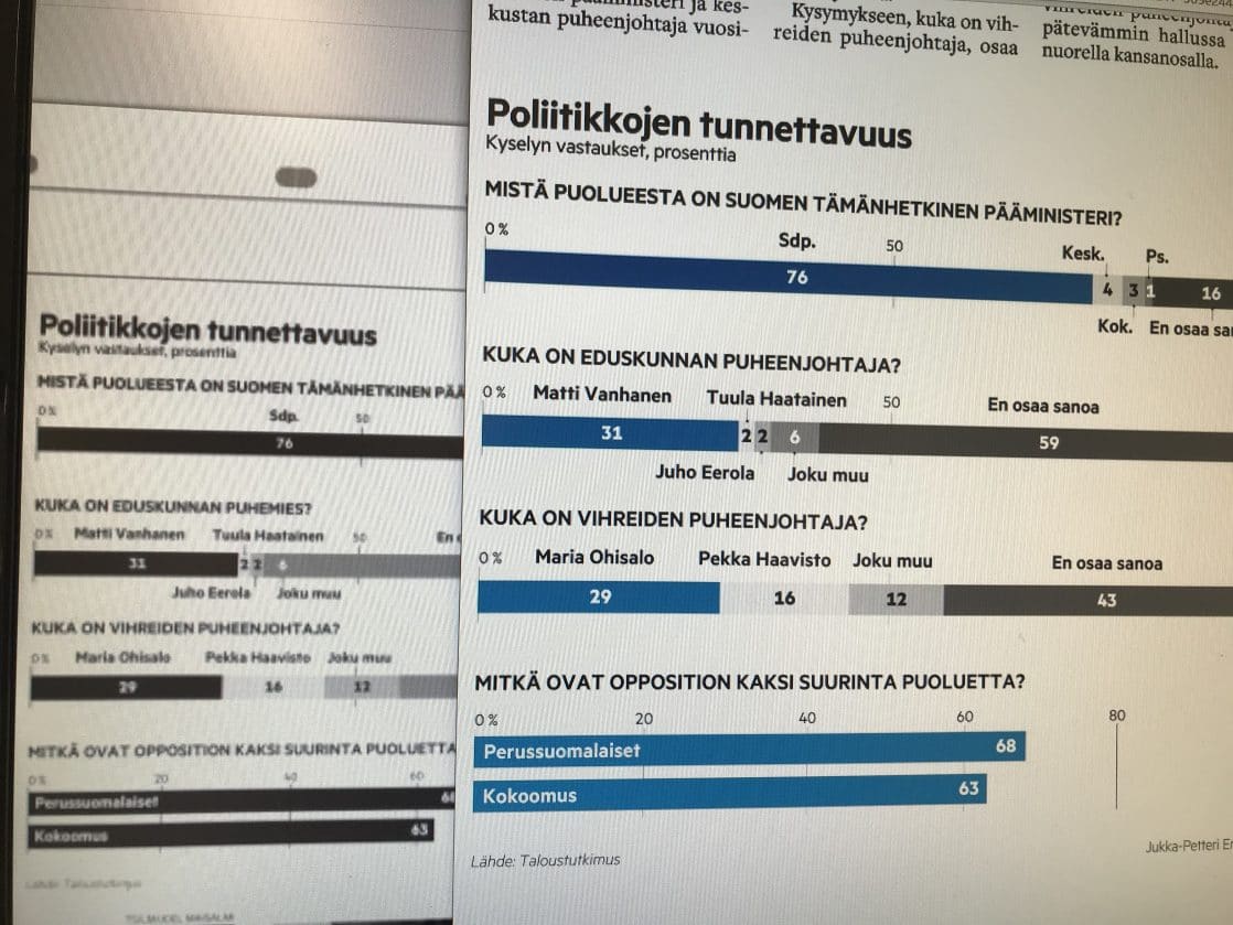 Näpertelyn sijaan kyse on isommasta ongelmasta: ihmisten harhaan johtamisesta. Journalismin uskottavuudesta. Asia selviää, kun kaivaa esiin Aamulehden näköislehtiversion (19.10.2019). Aukeamalla käsitelty juttukokonaisuus ei jätä tulkinnanvaraa ja antaa lukijoiden varsin yksiselitteisesti ymmärtää: ihmisiltä on kysytty tietämystä nimen omaan eduskunnan puheenjohtajasta. Tätä korostaa, että kysymys on muotoiltu kyselyn tuloksista tehtyyn grafiikkaankin näin ja alle laitettu lähteeksi Taloustutkimus.