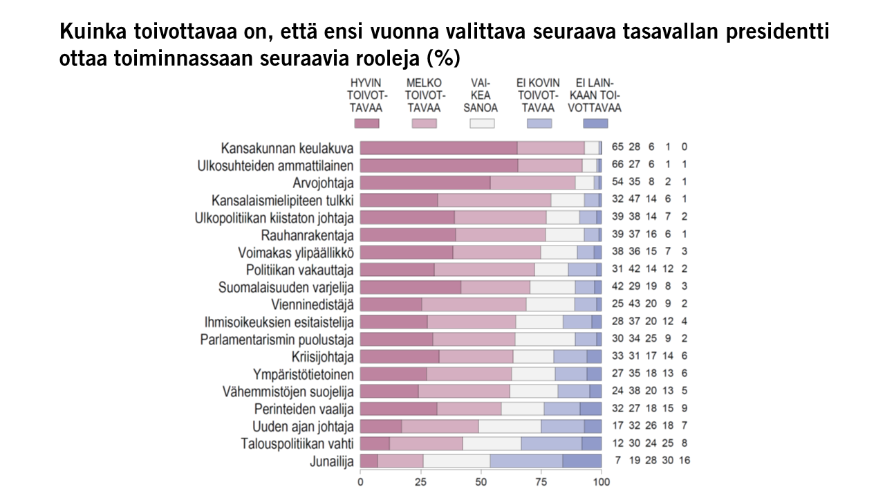 Tutkimuksessa selvitettiin, millaista presidenttiä suomalaiset toivovat. Vastaajia pyydettiin arvioimaan 19 mahdollisen roolin tai toimintatavan kohdalla, kuinka toivottavaa on, että omaksuisi niitä.