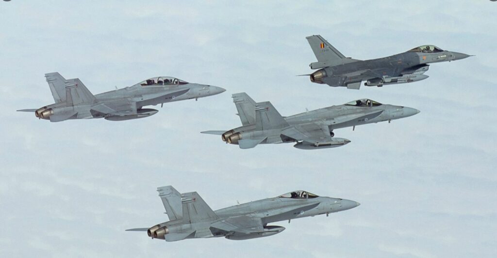 Suomen ilmatilassa lennettyyn kierrokseen osallistui F/A-18 Hornet -hävittäjiä Karjalan lennostosta ja belgialaisia F-16-hävittäjiä Ämarin tukikohdasta Virosta. #karlsto #puolustusyhteistyö pic.twitter.com/CrRgSoY26i
