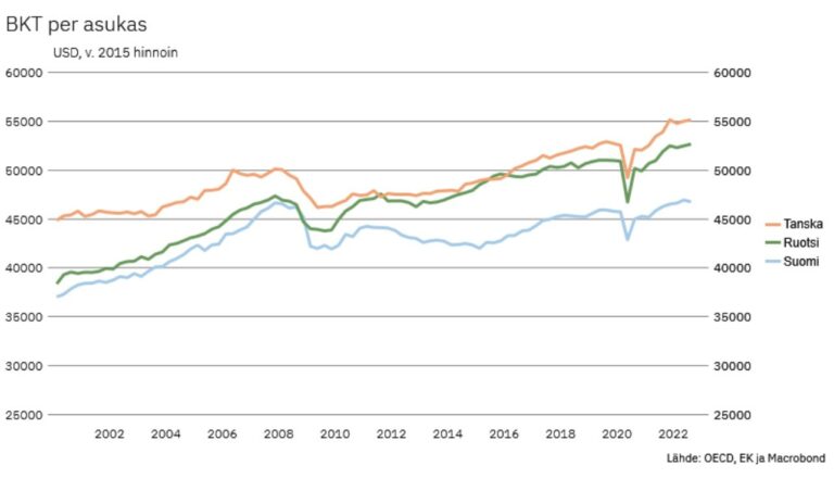 – Suomessa bruttokansantuote asukasta kohti niiasi alaspäin vuoden 2022 kolmannella neljänneksellä. Tanska ja Ruotsi jatkoivat kasvussa, Pakarinen avaa tilastoja.
