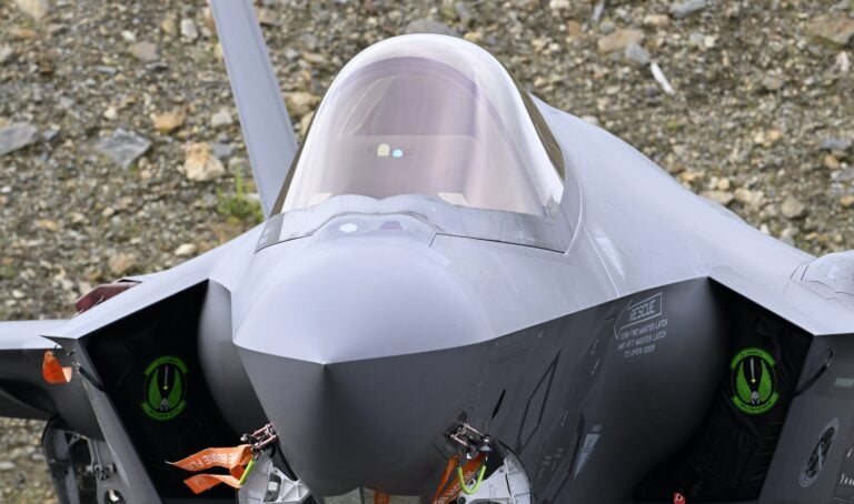 Yhdysvaltojen F-35A Lightning II -monitoimihäivehävittäjä Suomen isännöimän Atlantic Trident 25 -ilmavoimaharjoituksen mediapäivässä Pirkkalassa 26. kesäkuuta 2025. LEHTIKUVA / HEIKKI SAUKKOMAA