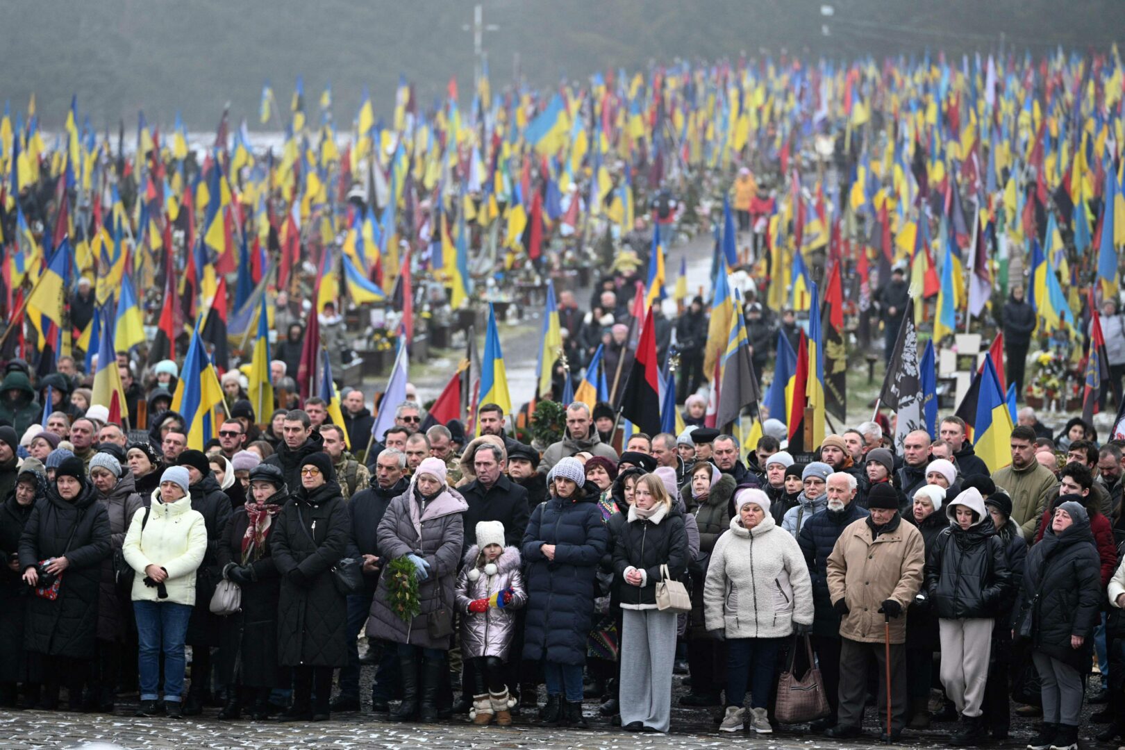 Ihmiset seisovat muistotilaisuudessa Lytšakivin sotilashautausmaalla Lvivissä 28. joulukuuta 2024. AFP/LEHTIKUVA/YURIY DYACHYSHYN