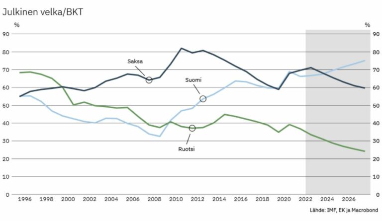 Hän on jakanut Twitterissä alla näkyvän kuvan, jossa vertaillaan Kansainvälisen valuuttarahasto IMF:n arvioita Saksan, Ruotsin ja Suomen velkasuhteen kehityksestä. Pakarisen mukaan Saksan ja Ruotsin velkasuhde tulee laskemaan vuosien 2020 ja 2027 välillä. Suomen velkasuhde puolestaan tulee nousemaan kuudella prosentilla.