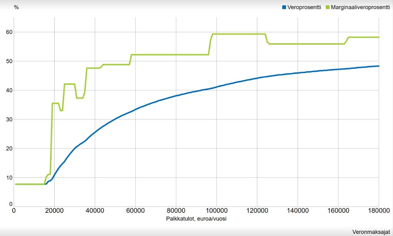 Finnveran pääekonomisti Mauri Kotamäki toteaa, että ansiotuloverotuksen rajaveroasteet ovat taas valokeilassa. Hän on jakanut graafin, joka näyttää rajaveroasteiden hyppäykset ansiotulojen noustessa verrattuna henkilön veroprosenttiin.