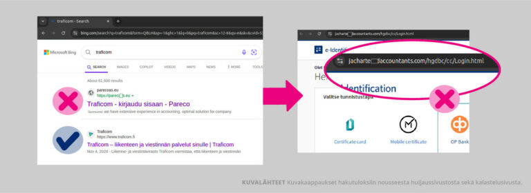 – Väärennetylle sivulle joutuu yleensä seuraamalla väärennettyä linkkiä. Väärennettyjä linkkejä levitetään yleensä huijaussähköposteissa, tai kuten tässä tapauksessa, masinoiduilla hakukonetuloksilla, Kyberturvallisuuskeskus huomauttaa.