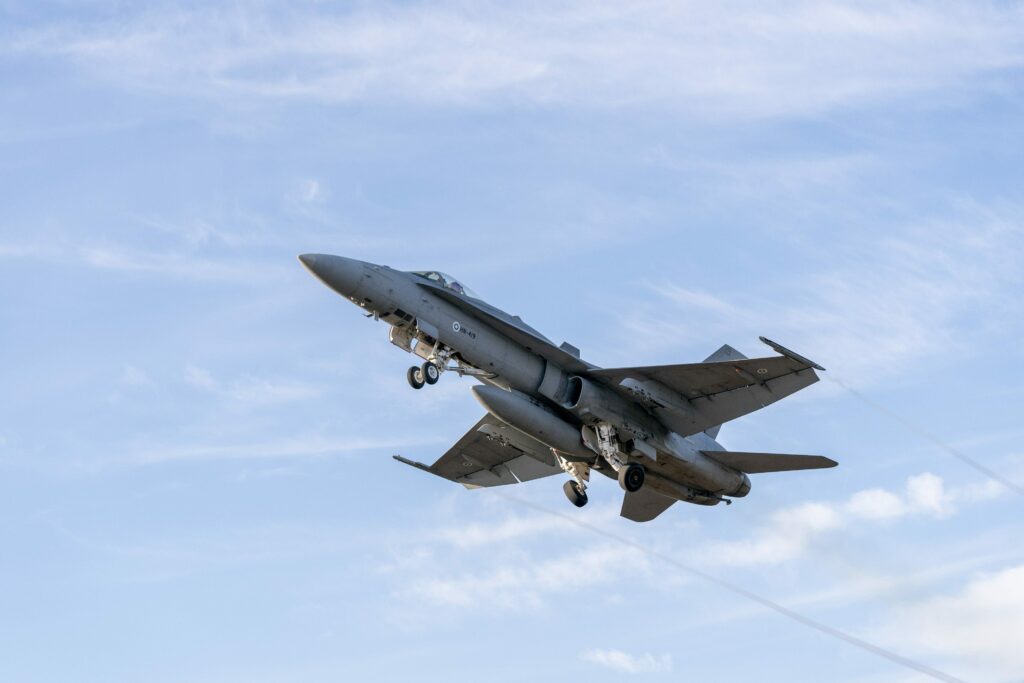 Kansanedustaja Jukka Kopra (kok.) on julkaissut Twitterissä jutun alta löytyvän videon, jossa ilmavoimien F-18 Hornet -hävittäjä lentää hetken kansanedustajien lentokoneen vieressä.