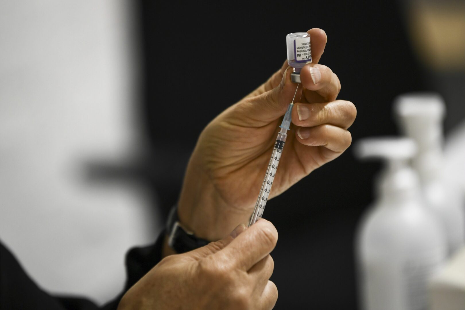 Hoitaja valmistelee koronarokottetta Jätkäsaaren rokotuspisteellä Helsingissä. LEHTIKUVA / EMMI KORHONEN