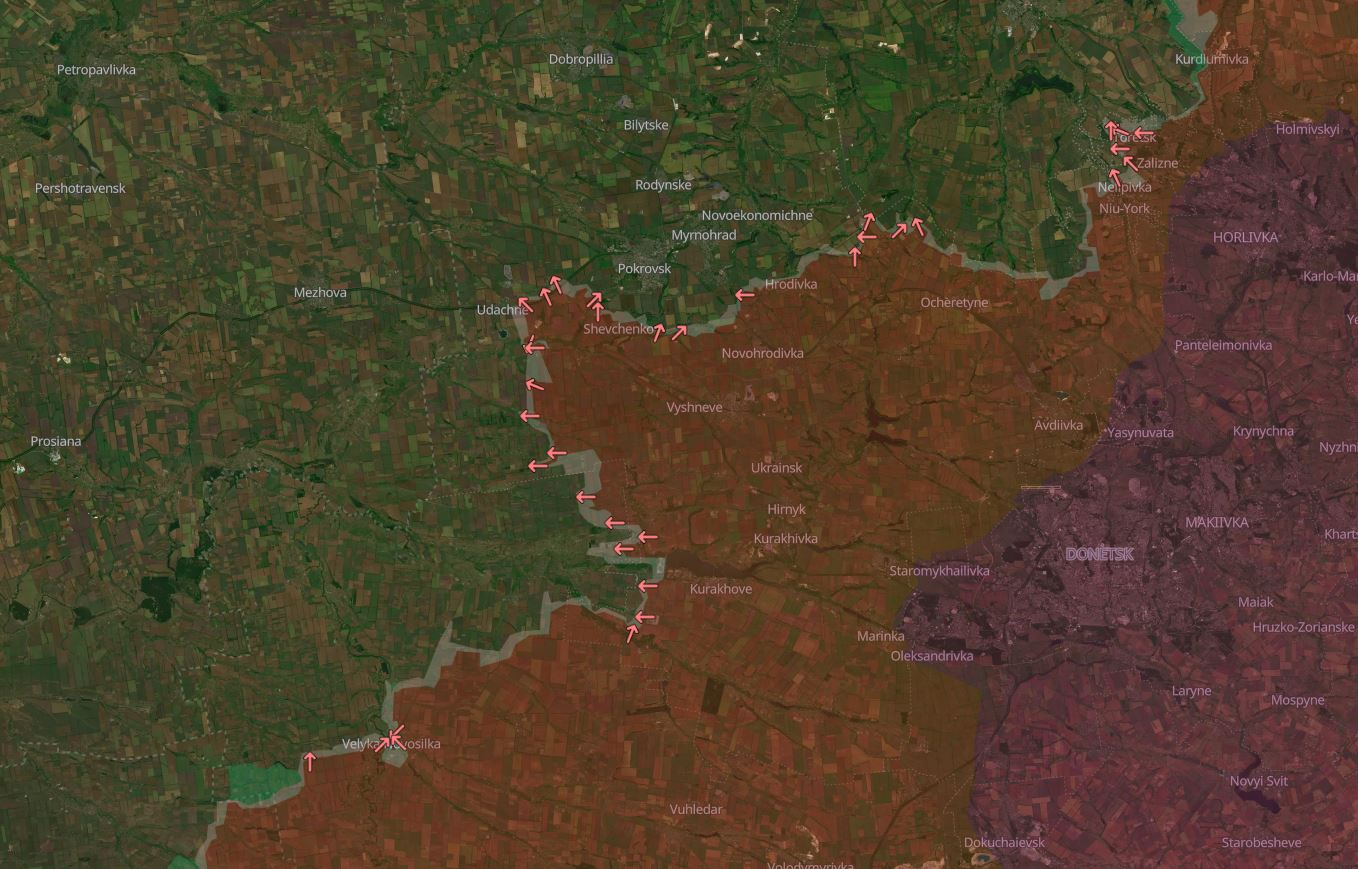 Venäjän asevoimat ei ole rynnäköinyt suoraan Ukrainalle tärkeään huoltokaupunkiin vaan on toistaiseksi pyrkinyt kiertämään sen sivustaan etelästä. Hyökkäyskärki on vain kolmen kilometrin päässä Pokrovskista. Saarto- ja läpimurtouhkan arvioidaan kohonneen lähialueella. Kremlin joukot ovat lisäksi vain viiden kilometrin päässä Dnipropetrovskin alueen rajasta.
