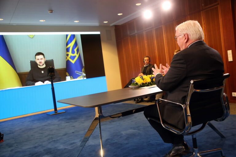 Saksan presidentti Frank-Walter Steinmeier keskustelemassa Ukrainan presidentti Volodymyr Zelenskyin kanssa 17. tammikuuta. DPA/LEHTIKUVA/WOLFGANG KUMM