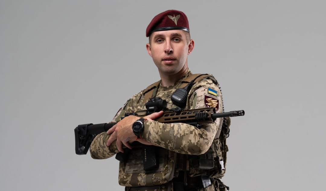 Sotasaaliina Revutskyillä on tuhoamansa venäläispataljoonan komentajan Sergei Tšebnevin hihamerkki, jonka hän aikoo lahjoittaa museoon.