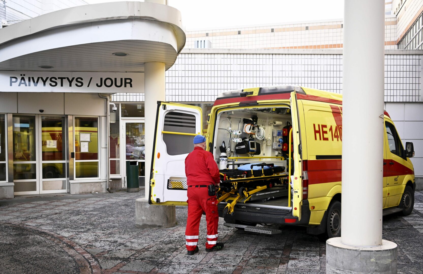 Ambulanssi Peijaksen sairaalan edessä Vantaan ja Keravan hyvinvointialueella 2023. LEHTIKUVA / VESA MOILANEN