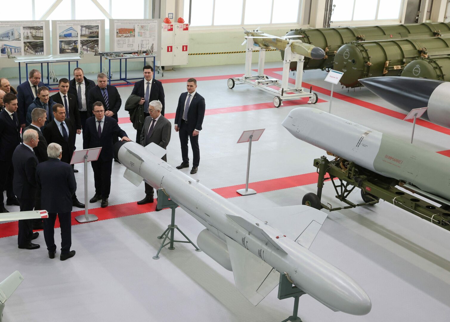 Dmitri Medvedev vierailulla ohjustehtaassa Dubnassa 2. helmikuuta. AFP/LEHTIKUVA/YEKATERINA SHTUKINA